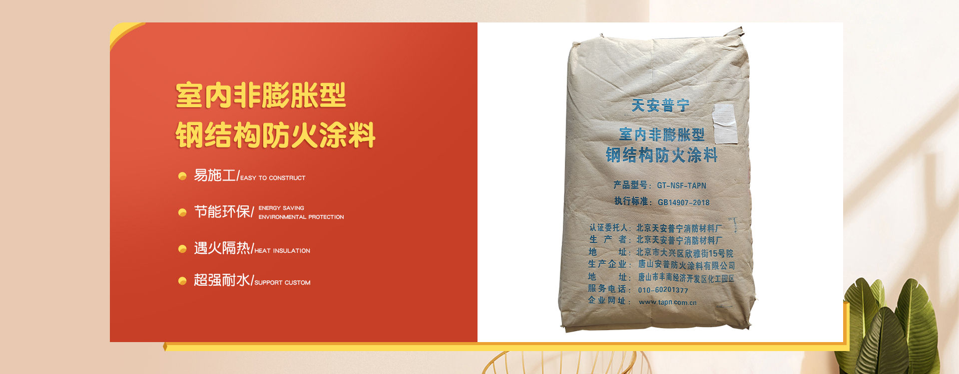 北京天安普寧消防材料廠是一家從事防火涂料二十多年生產企業,企業集研制開發(fā)、生產銷售及各類防火涂料施工為一體。 企業員工總數100人,其中管理人員20人,科研人員10人,銷售50人,其他員工十多人。企業生產用地面積2000平方米左右,辦公用地面積1000平方米。擁有先進的生產設備20多臺,年生產量10000余噸。  企業擁有一支高學歷、資歷深的研發(fā)隊伍,以科學的管理,先進成套的生產流水線設備及完善的產品質量檢驗措施,開發(fā)出TAPN系列防火涂料產品,可以滿足于各類建筑工程中不同基材、不同技術要求的防火保護,天安普寧系列防火涂料全部經過《國家消防及阻燃產品質量監(jiān)督檢驗中心》檢驗,理化性能合格,防火性能高,通過《應急管理部消防產品合格評定中心》認證并獲得《消防身份信息標識》。 企業結合多年的工程施工實踐經驗,培養了一支專業有素、經驗豐富、高質量、效率高的防火涂料施工隊伍,可承攬各類高層、多層、大跨度廠房及網架鋼結構防火涂料噴涂施工服務。 企業始終為用戶全心全意服務,不斷滿足各建設單位的要求,共同為我國的建筑消防事業作出更大的貢獻,衷心感謝新老客戶的支持,全體員工熱情歡迎廣大用戶的光臨惠顧。